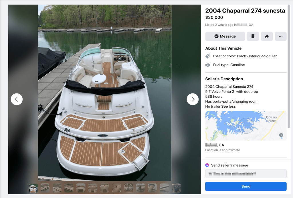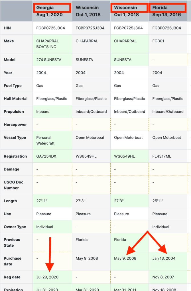 After looking over the registration details, we can see the original registration was issued in Florida (saltwater use) in 2004. The boat was then sold and moved to Wisconsin in 2008 where it remained until it was salvaged and sold through auction. The new owner presumably purchased it out of a salvage auction and moved it to Georgia in July 2020. The boat is now for sale without any disclosure of its past.