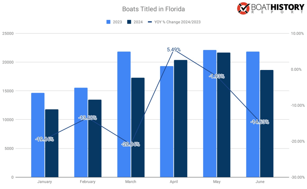 From January – June 2024, boat titles issued in Florida showed a 10.46% YOY decrease from 2023.
