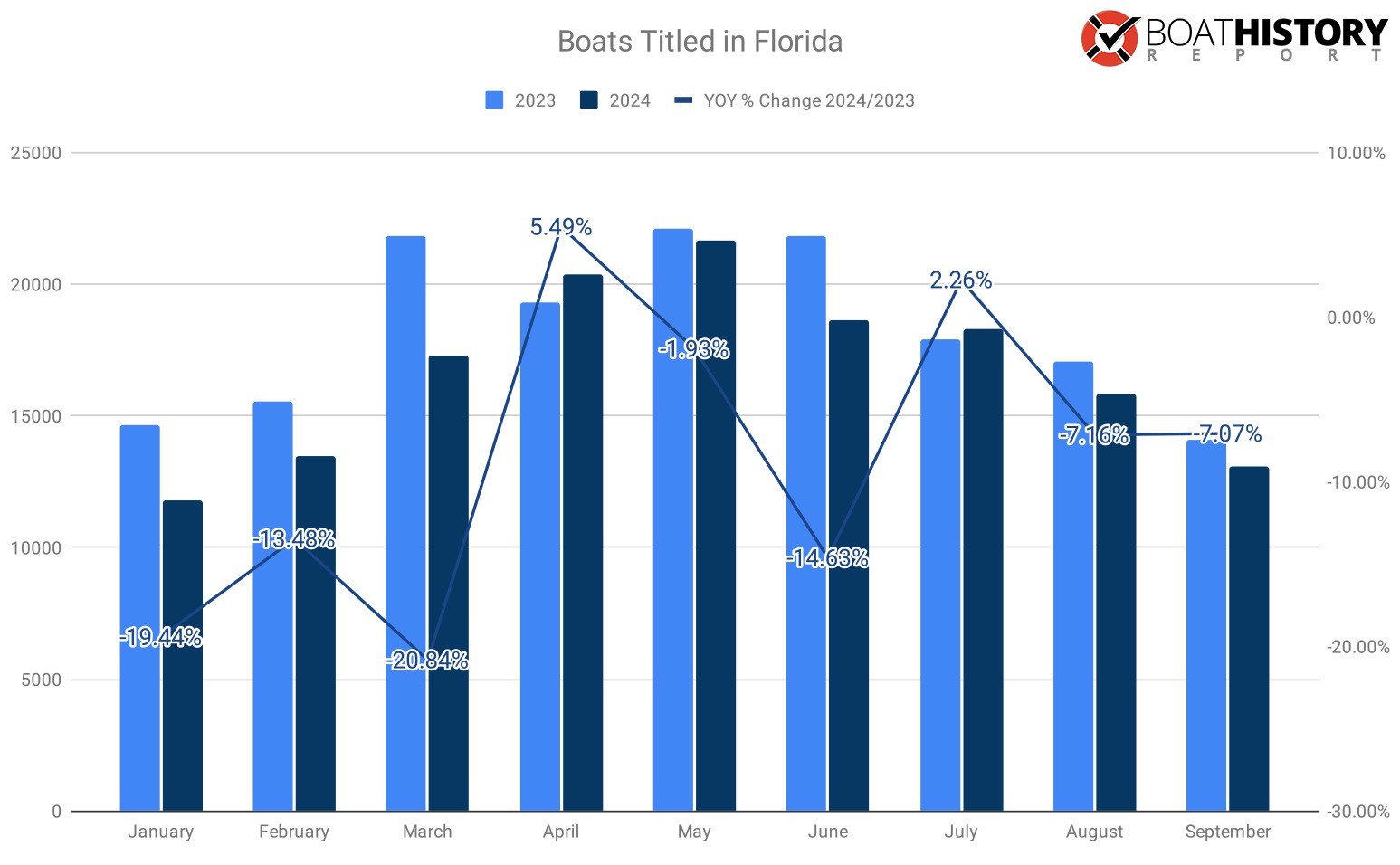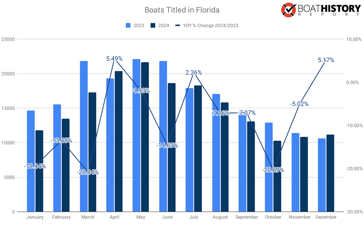 Year over year boat titles issued in Florida showed an 8.44% decrease from 2023 and a 5.83% decrease from the pre-covid numbers of 2019.